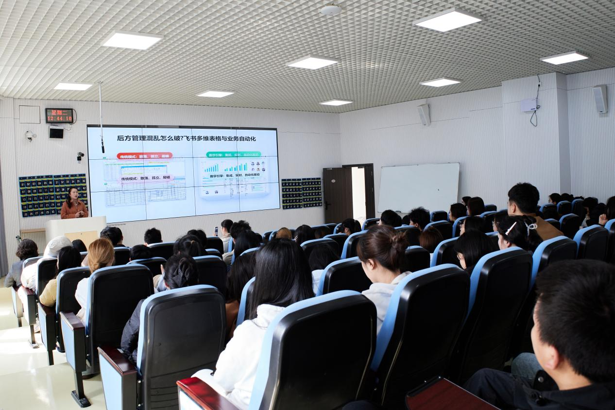 宣讲环节,郑丽娇以“产教融合,数字赋能——构建全校级AI创新人才培养体系”为主题进行了精彩分享,深入剖析了在“AI狂飙”的大环境下,企业人才需求的深刻变革。她通过飞书多维表格的实战案例,生动展示了如何借助自动化、集成化的数字工具,将复杂的业务流程简化为“一张表”管理,实现数据驱动决策与高效协同。
